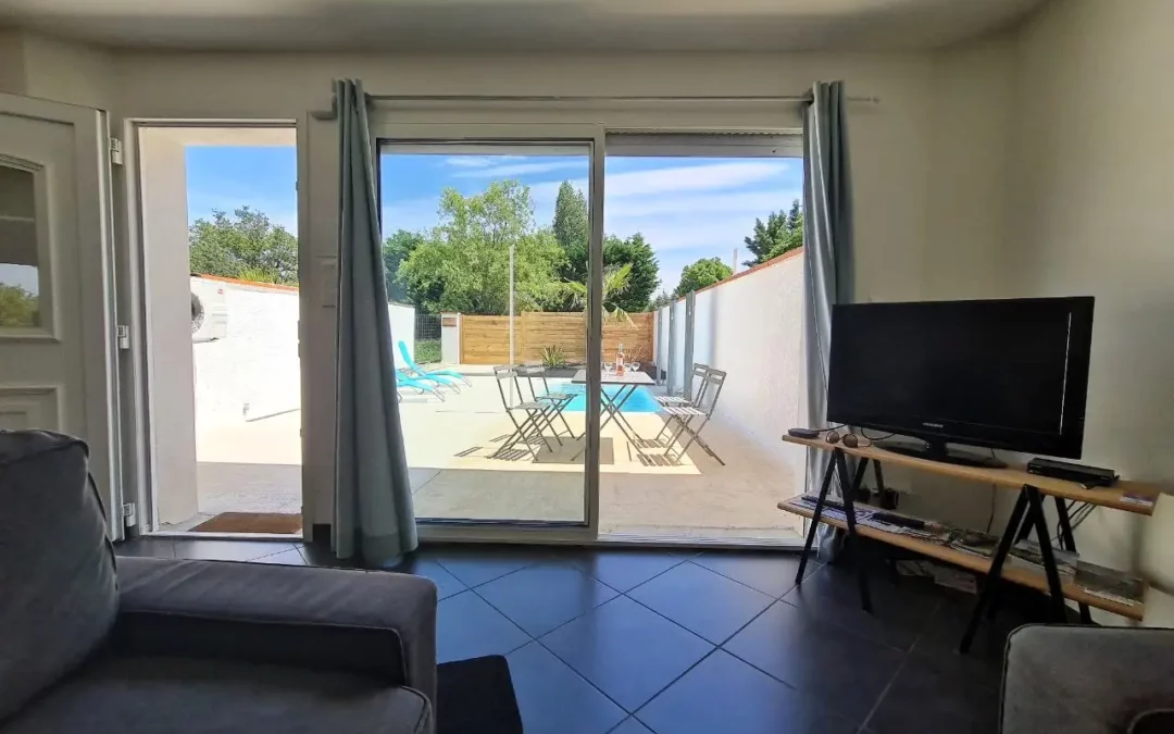 Gite with large living room overlooking terrace, swimming pool and garden furniture